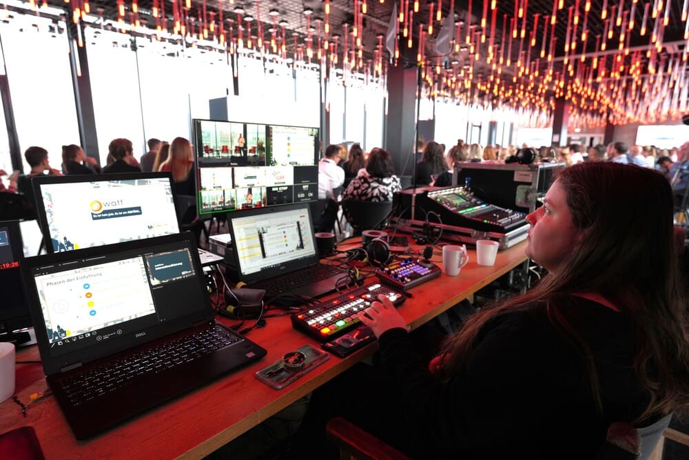 Anders als viele Präsenzevents, die mit relativ wenig Technik auskommen, brauchen Hybrid-Veranstaltungen Platz für größere Regien, Kameras und Bühnenbeleuchtung. Daher ist es wichtig, 2–3 Tische für die Regie mit einzuplanen.